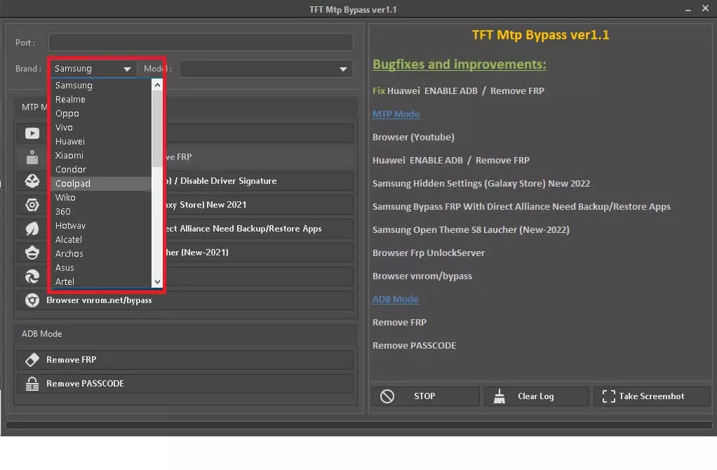 TFT MTP Tool also has the functions to Enable Huawei ADB / Remove FRP, Disable Driver Signature Windows, Install S8 Launcher (Galaxy Store), Samsung Emergency Mode FRP Reset, Remove FRP & Passcode through ADB. It supports more than 20 brands includes Samsung, Huawei, Infinix, Oppo, Vivo, Realme, Condor, Coolpad, Wiko, 360, Alcatel, Hotwav, Blu, OnePlus, Motorola, Tecno, Nokia, etc and many more.